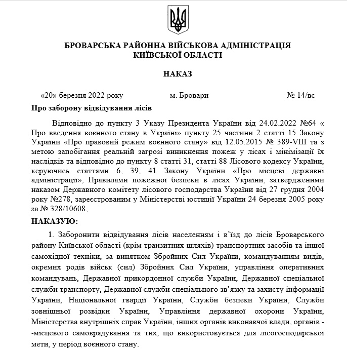 Начальник Броварської районної військової адміністрації Павло Проскочило від 20 березня видав наказ про заборону ходити і в’їжджати в ліси Броварського району.