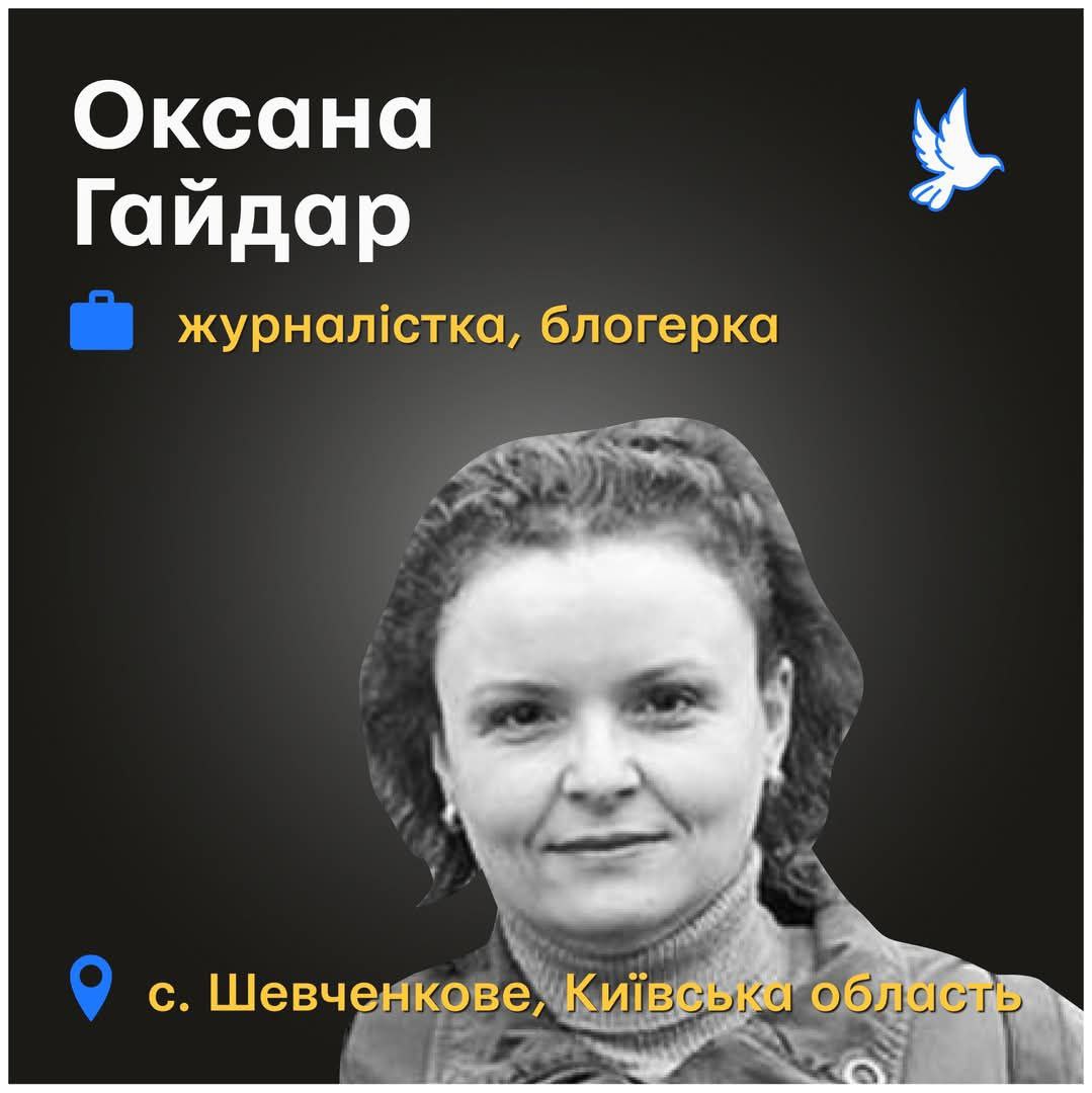 Останній допис у Твіттері Оксани Гайдар датований 11 березня. «Від учора в нас немає світла, ледь животіє інтернет. Русня нікому не дає виїхати – стріляє по автівках та навіть по велосипедах насмерть. Можна лише тихо сидіти по хатах. Гуманітарна катастрофа – питання макс.місяця. Твітер я видаляю, сподіваюся, що ще побачимось. Все буде Україна!»
