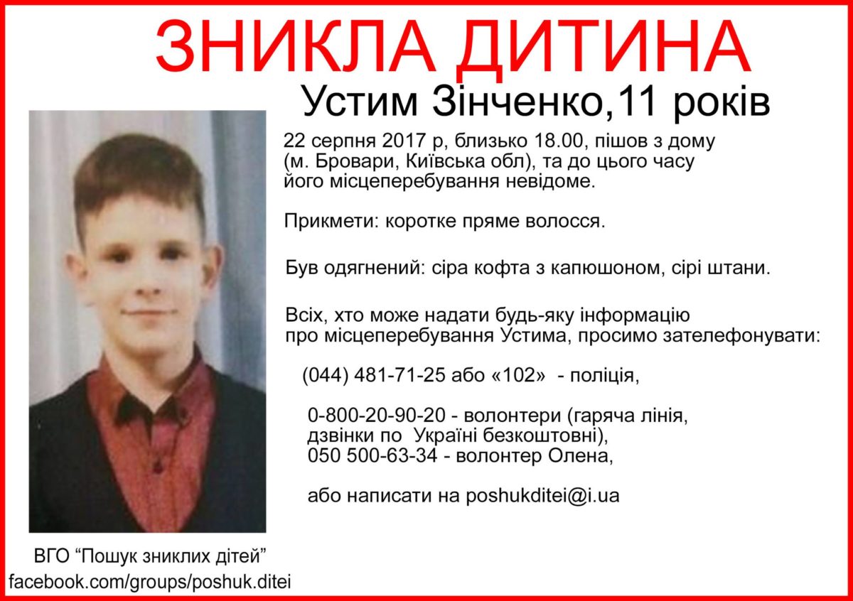 Устим Зінченко зник ще 22 серпня. Вже 9 днів про місцезнаходження 11-річного хлопця нічого невідомо.
