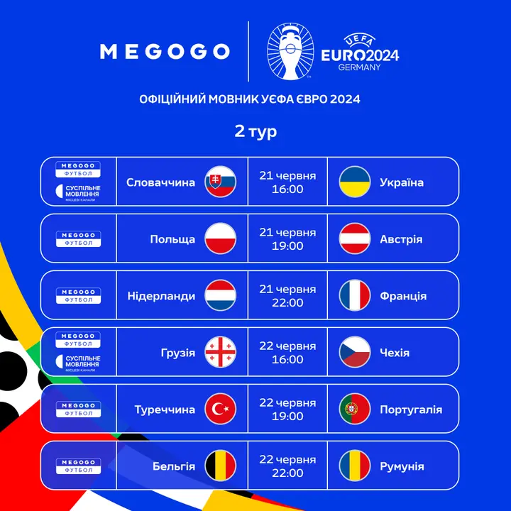 Медіасервіс MEGOGO став офіційним мовником чемпіонату Європи з футболу УЄФА 2024 року. Усі матчі турніру будуть доступні ексклюзивно на MEGOGO. Суспільне Мовлення стане партнером медіасервісу в трансляції УЄФА Євро-2024. Вболівальники зможуть дивитися окремі матчі Євро-2024 на місцевих телеканалах «Суспільного» (наприклад, «Суспільне Львів», «Суспільне Черкаси», «Суспільне Чернівці» та ін.) у цифровому ефірі Т2, кабельних мережах та IPTV (крім OTT). Про це повідомляє «Трибуна».